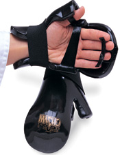 Patented finger grip design accommodates all open and closed hand techniques. Vinyl strap across the palm for tighter grip. New fuller coverage double foam padding over the knuckles. Made in USA.
